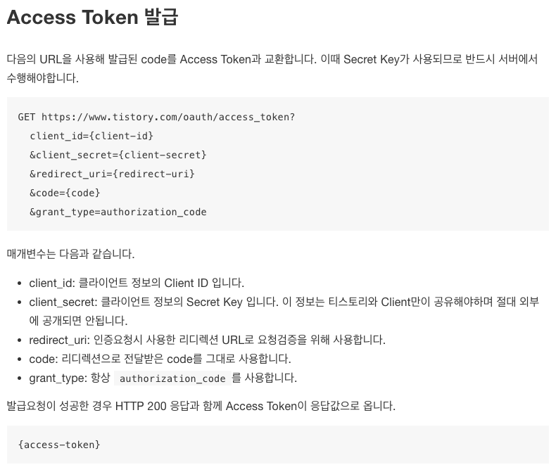 Access Token을 발급받기 위해서 Authorization Code방식을 이용합시다.(기존에 사용되던 Implicit 방식은 더 이상 지원되지 않습니다. tistory.github.io/document-tistory-apis/ 참고)