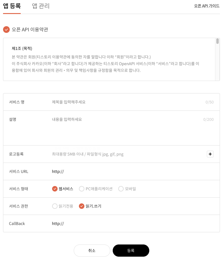 CallBack -> API 사용시 필요한 Token을 발급받기 위해 사용할 주소를 적습니다.(서비스 URL처럼 자신의 블로그 주소를 사용할 수 있습니다.)