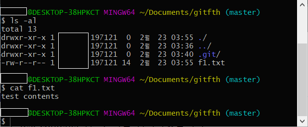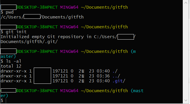 저는 버전관리를 gitfth 폴더 안에서 진행할 것이라서 첫 줄에서 보는 것과 같이 현재 디렉토리 위치를 gitfth 폴더로 맞춰놨습니다.