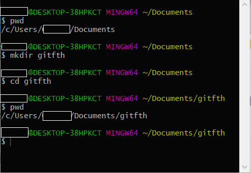 cd 명령어로 gitfth 이라는 폴더에 진입하였고, pwd 명령어로 다시 현재 디렉토리 위치를 확인한 결과 gitfth 폴더에 제대로 들어왔음을 확인할 수 있습니다.