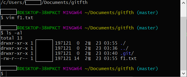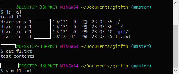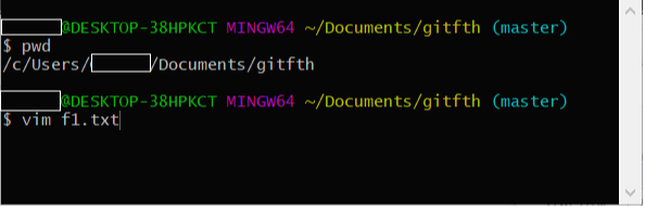1. pwd 명령어로 현재 디렉토리가 gitfth로 설정되어있는 것을 확인하고, vim 명령어를 사용하여 f1.txt라는 파일을 생성합니다.
