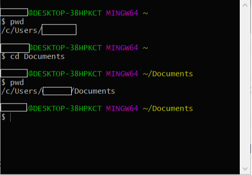 이동한 후 pwd 명령어를 통해 현재 디렉토리 위치를 확인하니 Documents 폴더에 있다는 것을 확인할 수 있습니다.