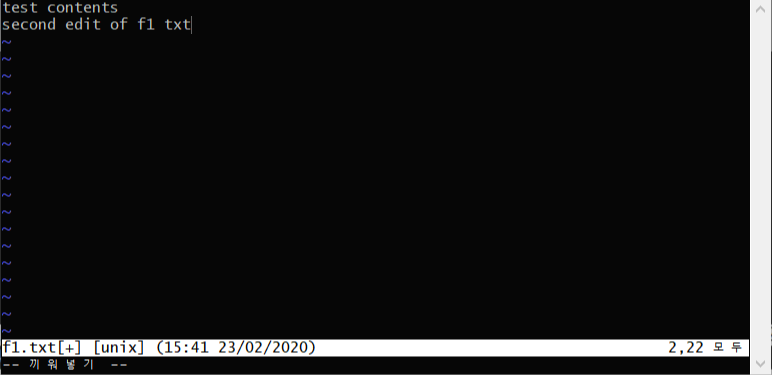 4. f1.txt 파일에 second edit of f1 txt 라는 내용을 추가하고 :wq 명령어를 사용해 메인 콘솔창으로 나옵니다.
