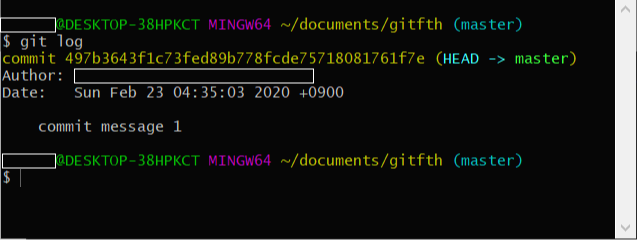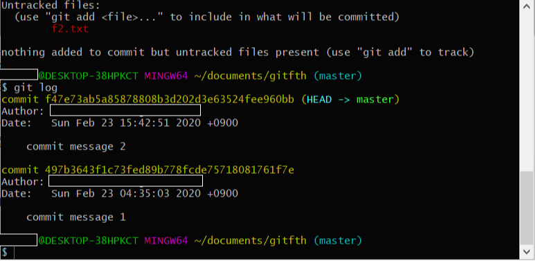 10. git log 명령어를 이용해 commit history를 보면 방금 적었던 commit message 2에 대한 commit이 추가된 것을 볼 수 있으며 commit message 2에 대한 commit id도 확인할 수 있습니다.