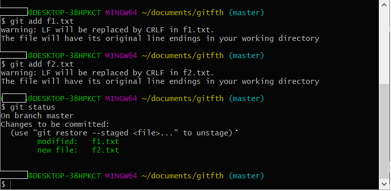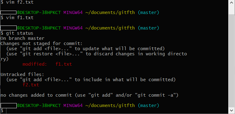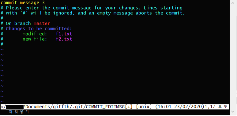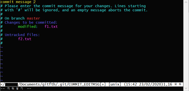 두 파일 다 Chages to be committed 섹션에 나와있으며 f1.txt는 내용이 수정되었으니 modified로 표시되어있고, f2.txt는 새로 생성된 파일이니 new file이라고 나와있습니다.