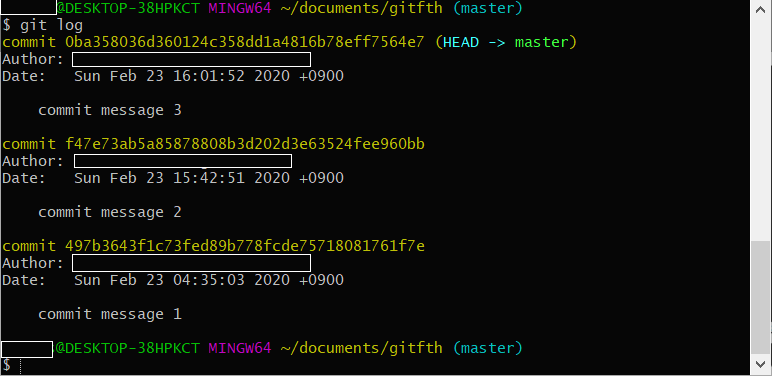 8. git log 명령어로 commit history를 보면 방금 commit한 commit message 3에 대한 commit이 보이는 것을 확인할 수 있습니다.