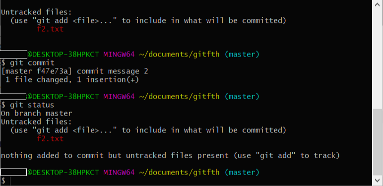 9. commit을 완료하고 git status 명령어를 이용하여 현재 상태를 보면 f1.txt에 대한 내역은 사라지고 f2.txt파일만 여전히 빨간색으로 표시되고 있습니다.