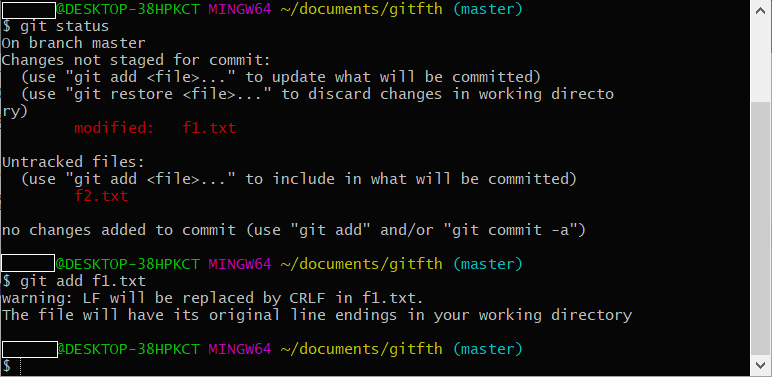 즉, f1.txt파일에 수정 사항(modified)이 생겼으며 이 수정사항은 아직 commit을 위해 stage에 올라있지 않다(Changes not staged for commit)라는 뜻입니다.