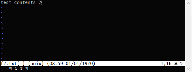 2. f2.txt 파일에 test contents 2라는 내용을 입력하고 :wq 명령어를 이용해 내용을 저장해준 후 메인 콘솔창으로 나옵니다.