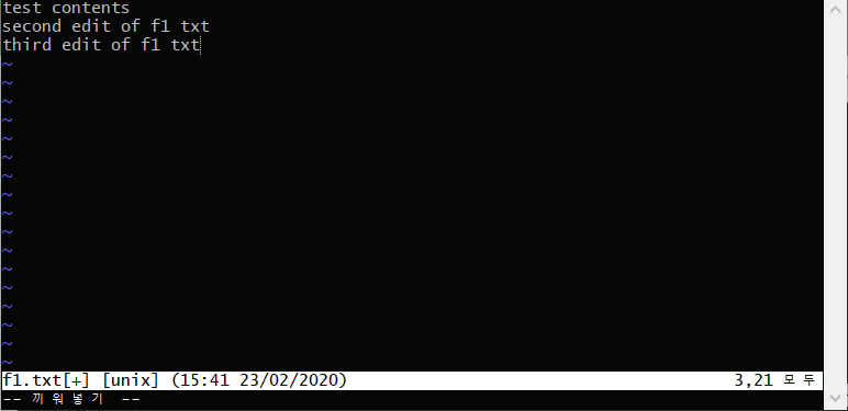 2. f1.txt 파일에 third edit of f1 txt라는 내용을 입력하고 :wq 명령어를 이용하여 저장 후 메인 콘솔창으로 나옵니다.