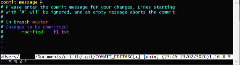 2. 이 상태로 f1.txt가 modified된 것을 확인합니다.