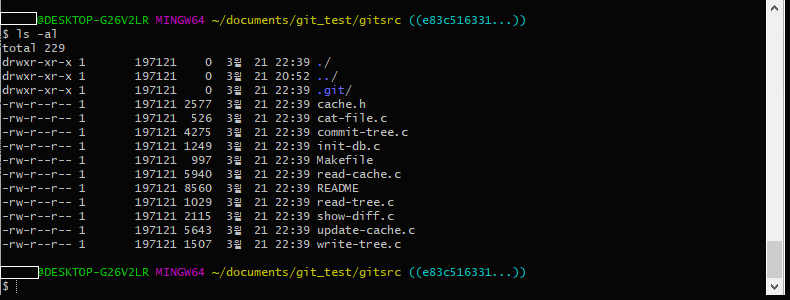그리고 ls -al을 쳐보면 아래 이미지처럼 이 commit 당시에 존재했던 soure code 목록이 나옵니다.