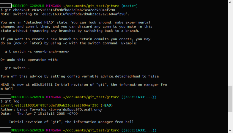 그러면 branch가 master에서 commit_id로 바뀐 것을 알 수 있습니다.
