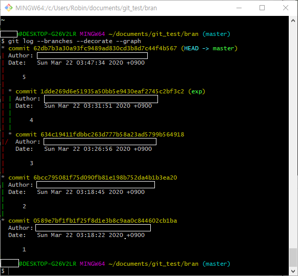 위 이미지를 보면 master는 가장 최근 commit이 2이고, exp는 가장 최근 commit이 4라는 것을 알 수 있습니다.