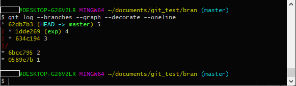exp branch가 5번 commit도 가지게 하여 master branch와 exp branch가 완전히 동일한 상태가 되도록 해볼 것이다.