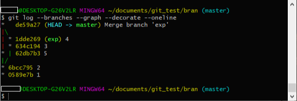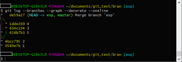 이제 master branch는 master branch에서 작업한 5번 commit과 exp에서 작업했던 3, 4번 commit을 모두 가진 상태가 됩니다.