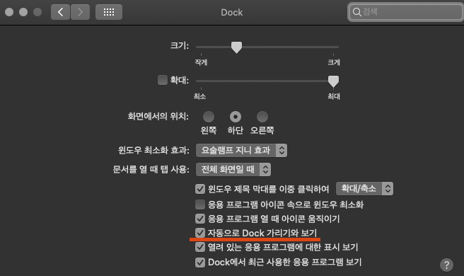 맥북의 Dock 설정에서 위처럼 '자동으로 Dock 가리기와 보기'를 체크하시면