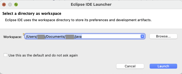 그 후 원하는 worksapce 경로를 선택한 후 Launch 버튼 클릭
