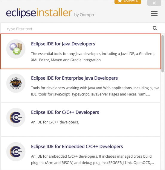 그리고 나서 위와 같은 화면이 뜨면 Eclipse IDE for Java Developers를 클릭해줍시다.