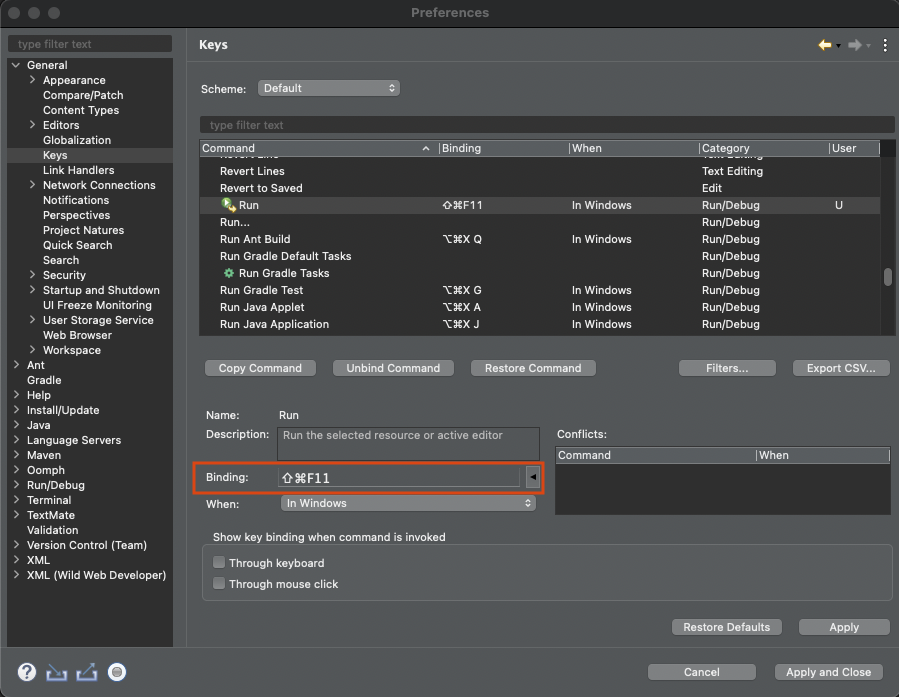 Eclipse의 Preference -> General -> Keys 메뉴를 들어가면 위 이미지처럼 여러 Command에 대한 설정을 할 수 있으며
