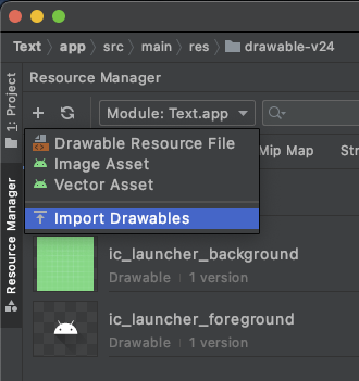 일단 원하는 이미지는 Resource Manager에서 Import Drawables 버튼을 클릭하여 import할 수 있습니다.