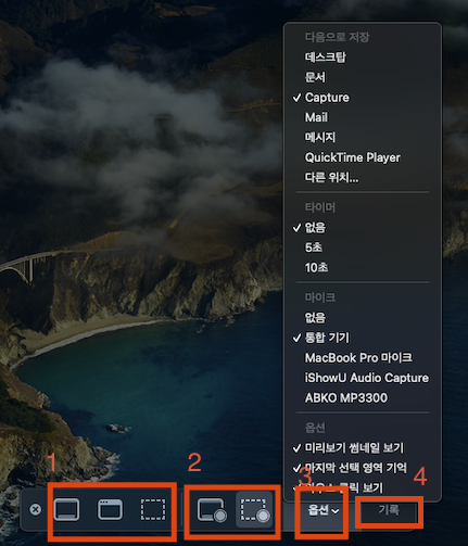 '전체 화면 기록' = 화면 전체를 녹화 (위 이미지의 1번 부분)