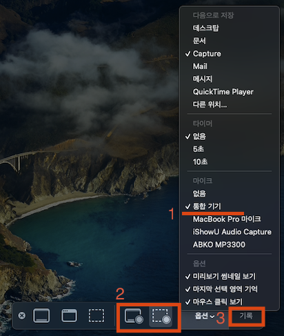 1. 그리고 Command + Shift + 5 단축키를 눌러 녹화 옵션창을 띄운 후 옵션에서 '통합 기기'를 선택해줍시다.
