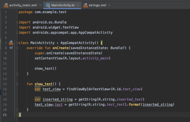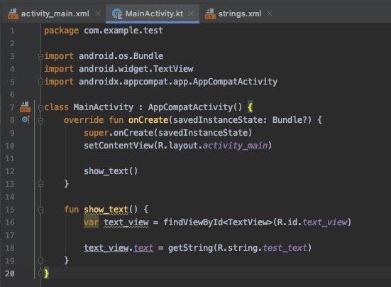 이제 미리 strings.xml에 선언해뒀던 id = test_text인 string을 불러와봅시다.