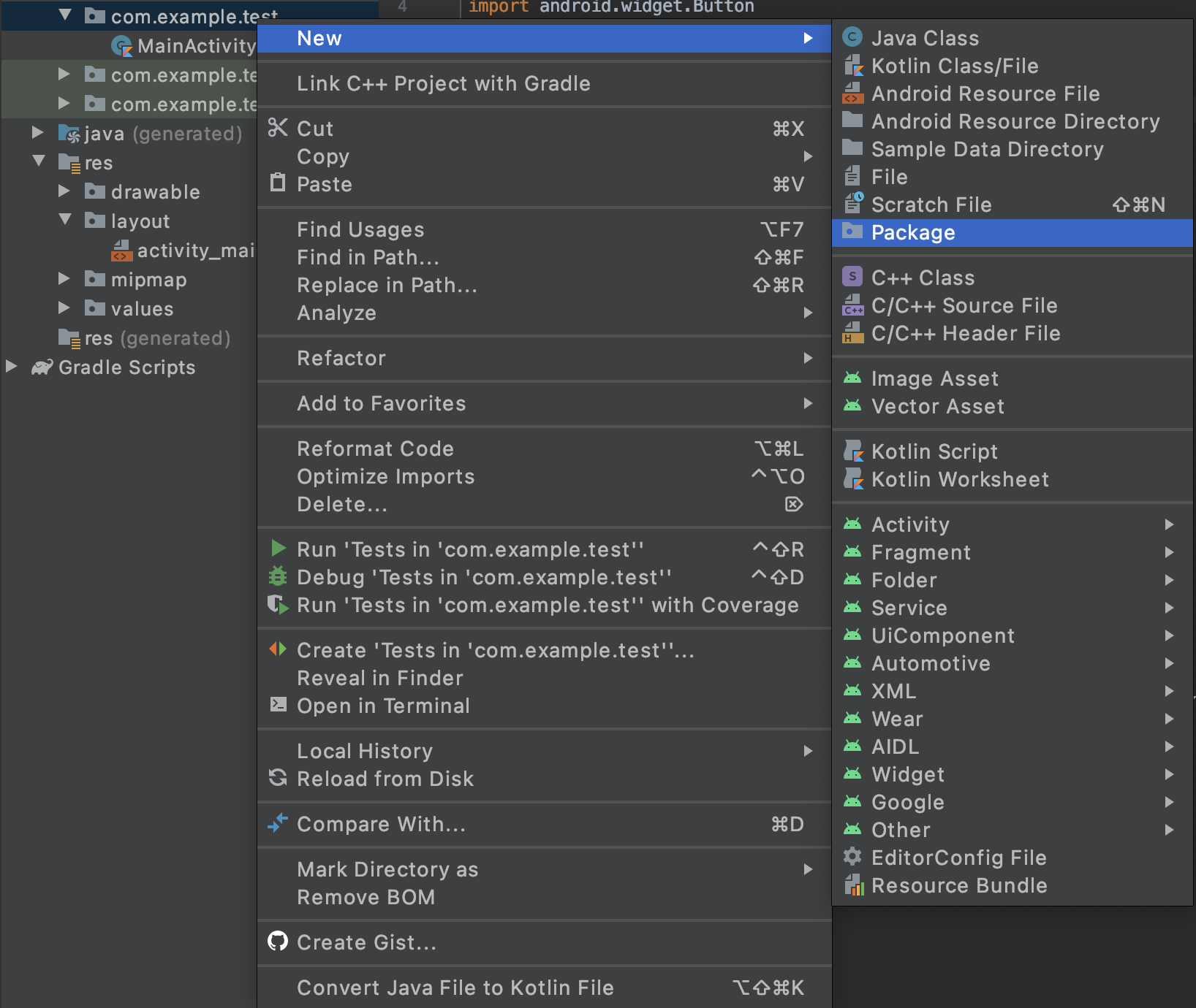 먼저 아래 이미지처럼 MainActivity.kt가 있는 곳에 Package를 만들어줍시다.