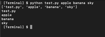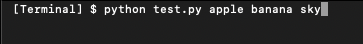 이제 test.py 파일을 terminal에서 실행할 때 apple, banana, sky라는 3개의 인자를 전달하면