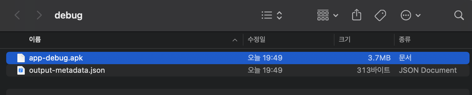 그러면 위처럼 finder가 apk 파일이 있는 directory를 열어주는데