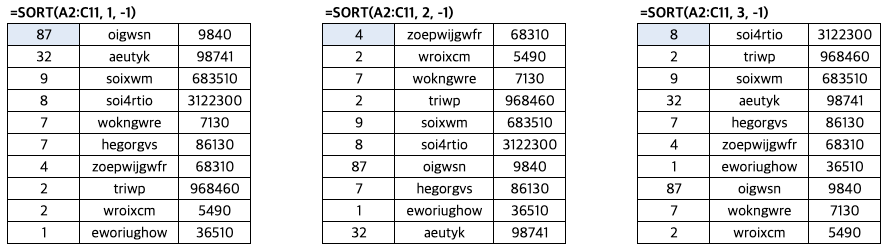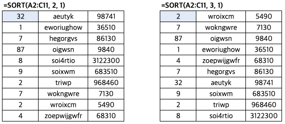 위 예시는 동일하지만 정렬 기준이 되는 컬럼이 각각 두 번째 컬럼, 세 번째 컬럼인 예시입니다.