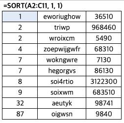 A2:C11 -> 정렬할 원본 데이터의 범위입니다.