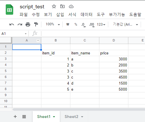 Script를 이용해 Spreadsheet를 조작하려면 항상 Spreadsheet 정보를 얻어와야 합니다.
