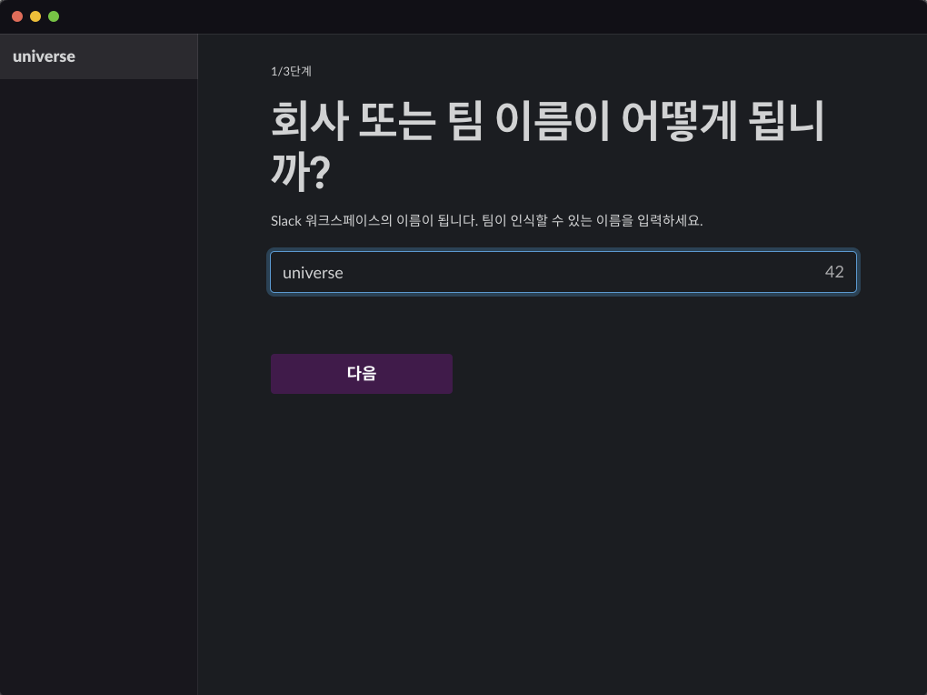Slack app 열기를 눌러주면 위처럼 설치한 Slack desktop app으로 이동되며 팀이름을 입력하라고합니다.