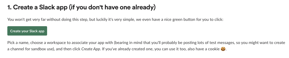 위 링크에서 1번 설명을 보면 Create your Slack app이라는 초록 버튼이 있습니다.