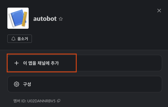 만약 나의 slack app(autobot)을 현재 채널이 아니라 다른 채널에 추가시키고 싶으면 앱에서 slackbot을 우클릭하고 앱 세부정보 열기를 클릭합니다.