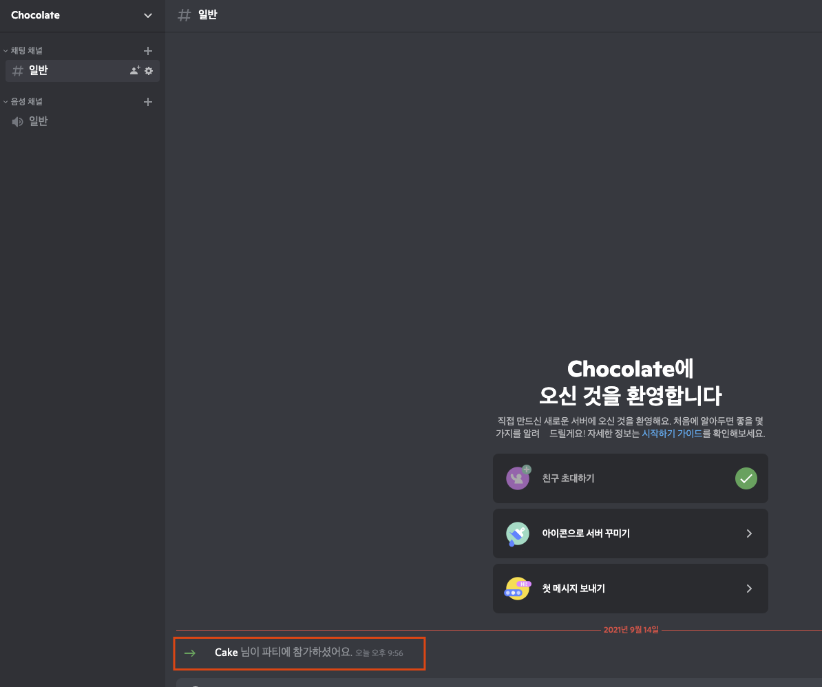 그러면 정상적으로 제가 만든 Cake bot이 저의 Chocolate 채널에 들어와진것을 알 수 있습니다.
