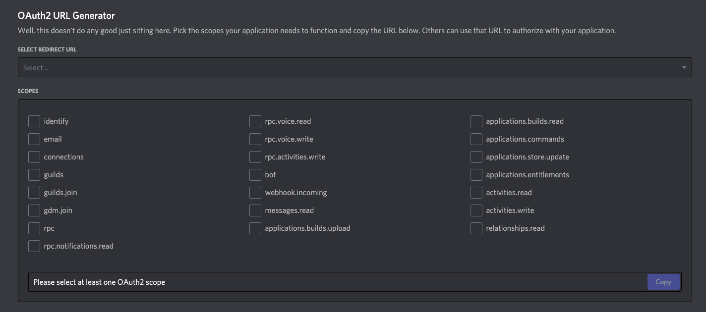 그러면 위처럼 SCOPES라는 부분에 권한을 선택할 수 있는 체크박스들이 나오는데 원하는 권한을 선택하면 됩니다.