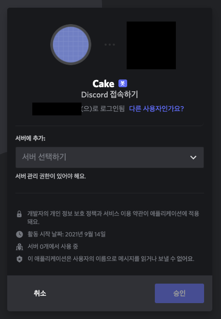 제가 만든 채널(서버)을 선택한 후 승인을 눌러줍시다.
