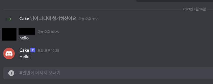예를들어, hello라는 글자를 내가 채널에 썼고 discord bot이 hello라는 글자를 입력해서 똑같이 hello라는 글자를 채널에 보냅니다.