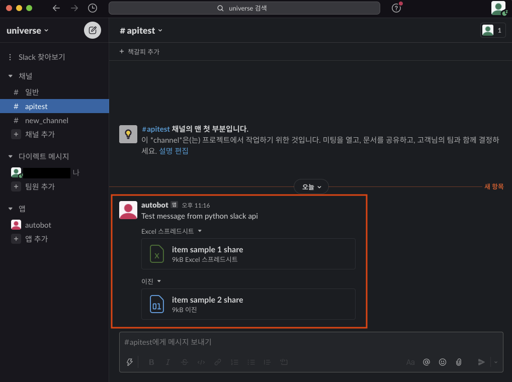 이제 슬랙에 파일을 업로드해봅시다.