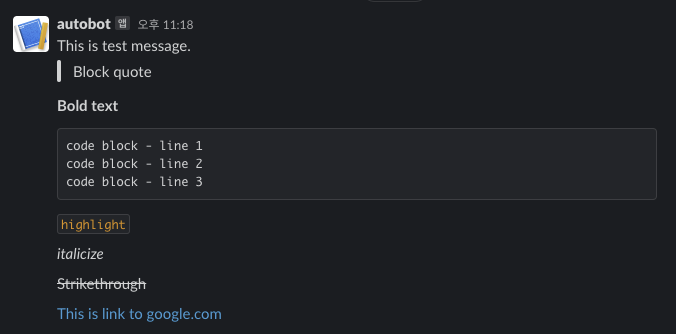 Slack markdown formatting에 대한 자세한 내용은 아래 링크를 참고하면 됩니다.