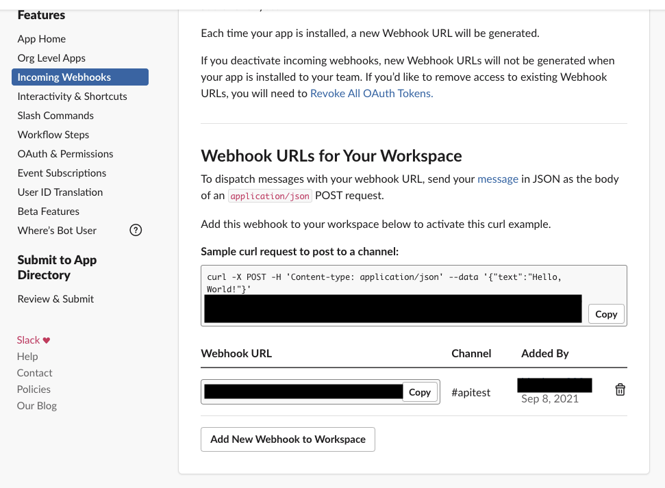 Slack API 등록, Slack Webhook 등록, Slack App 생성, Slack App 설치 Link