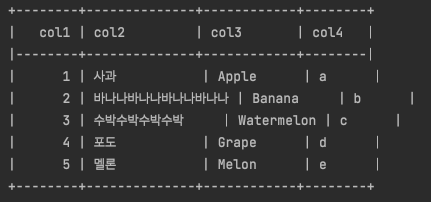 'col2': ['사과', '바나나바나나바나나바나나', '수박수박수박수박', '포도', '멜론'],