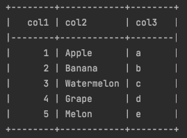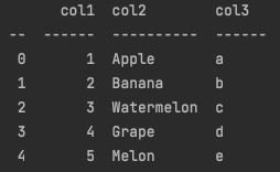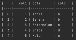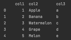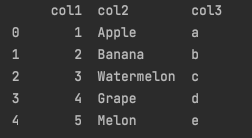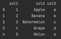 'col3': ['Apple', 'Banana', 'Watermelon', 'Grape', 'Melon'],