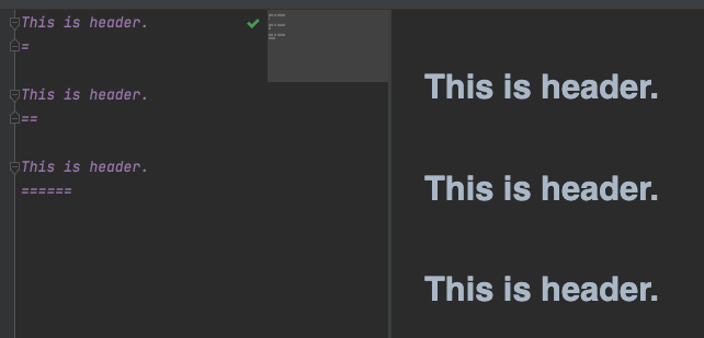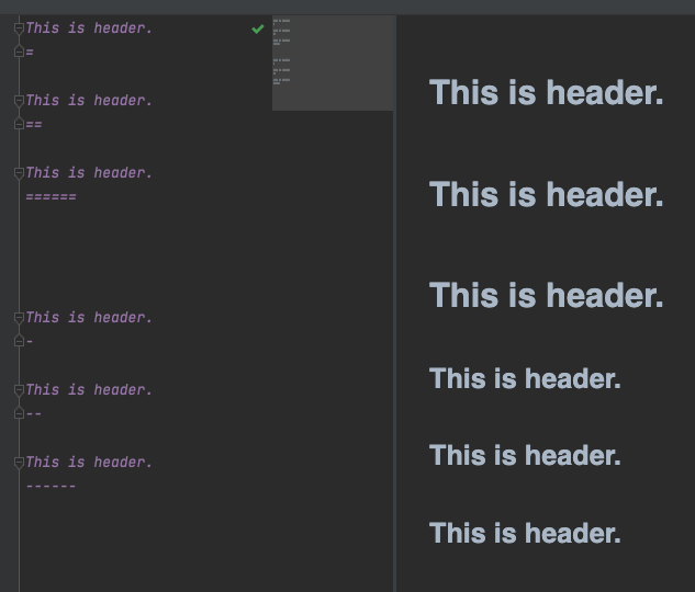 위처럼 제목(=)과 부제목(-) 표시가 된 텍스트의 크기를 비교하면 부제목이 더 작은걸 알 수 있습니다.
