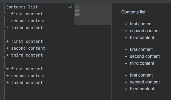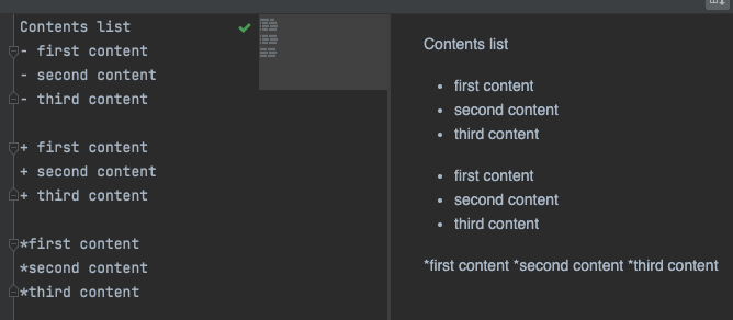 한 가지 주의할 점은 -, +, * 기호를 이용해서 목록으로 인식시킬거면 반드시 기호와 문자간에 한 칸을 띄워줘야합니다.