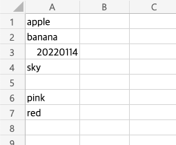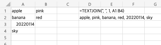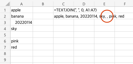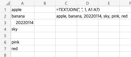 apple, banana, 20220114, sky, pink, red 처럼 A1부터 A7셀에 있는 모든 값들이 구분자 , 를 사이에 둔 채로 하나로 이어진 것이 보이죠.