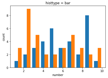 hist method에서 2개의 list나 array를 tuple에 담아 전달하면 아래 예시처럼 2개의 array에 대한 개수 분포를 나타내주는 그래프를 동시에 그려줍니다.